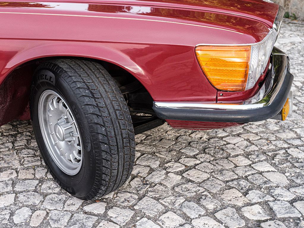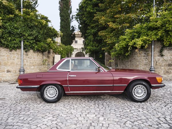 Mercedes 450SL del 1976 colore 516 mittelrot. Questo è un modello dell’ultima serie prima dell’uscita della 560SL. Ha un motore in grande efficienza ed è molto piacevole da guidare, con un’ottima coppia una progressione assai regolare, priva di strappi. La tenuta di strada e la maneggevolezza sono eccellenti.