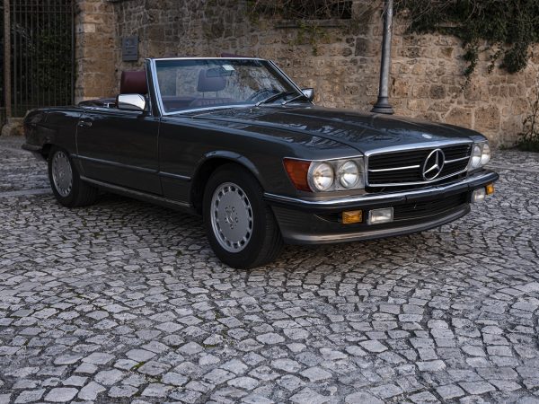 Mercedes 560SL del 1986, colore 172 anthrazitgrau. Questo modello è stato prodotto per il mercato americano ed è la migliore versione della famiglia W107. La dotazione di serie è veramente completa includendo l’ABS, l’airbag ed il differenziale autobloccante tra le numerose migliorie introdotte dalla Mercedes. Certo, la potenza massima rispetto al motore 5,6 litri montato sulle 560SEC e 560SEL europee è stata ridotta a causa delle leggi antinquinamento USA, ma la coppia motrice e l’equilibrio consumi/prestazioni è invidiabile. Il tutto rende la macchina molto piacevole da guidare, con reazioni molto pronte ed un’ottima accelerazione quando serve. La tenuta di strada e la maneggevolezza sono eccellenti.